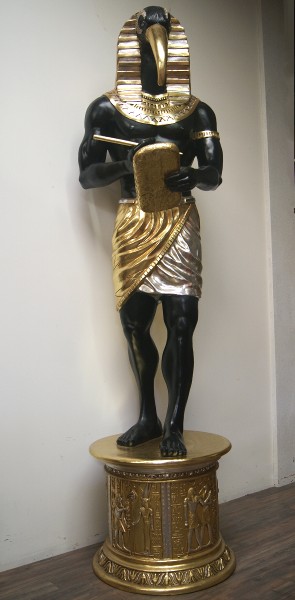 Thot, Divinité Égyptienne, debout sur une base cylindrique ornée de motifs.