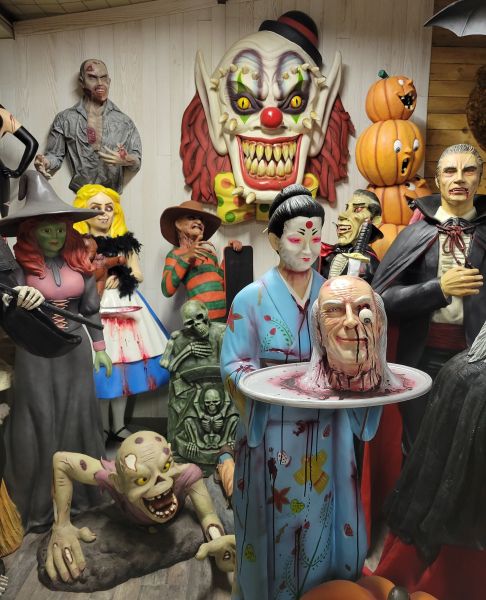 Statue d'une femme Japonaise en kimono traditionnel présentant une tête coupée sur un plateau.