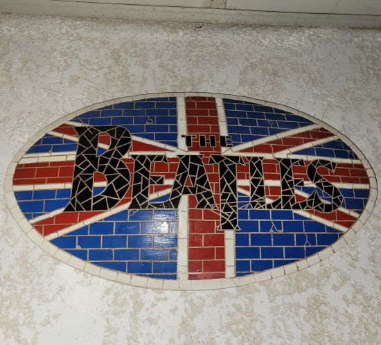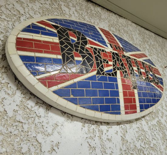 Moulage résine de forme ovale avec l'iscription The Beatles sur fond de drapeau Britannique