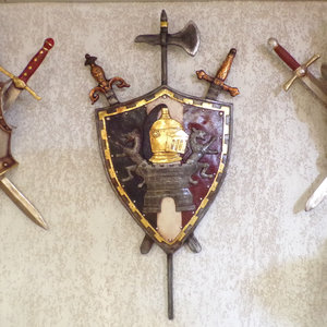 Partie d'armure, casque et cuirasse, avec 2 épées qui se croisent.