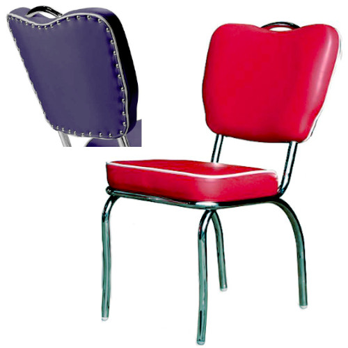 Très belle table style mobilier vintage américain. Look rétro pour cette table qui nous replonge dans les années 50 avec son plateau en formica et ses chromes étincelants. Elle a un design très original avec un plateau rectangulaire, des angles arrondis, une ceinture composée de deux tubes chromés reliés par des petites billes également chromées et un élégant piètement central avec deux cerclages reliant quatre pieds.