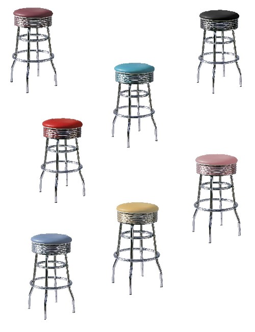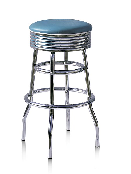 Le piètement est en métal chromé, le siège est pivotant avec une assise en skaï et une ceinture alu avec rappel de la couleur de l'assise. Ces sièges apportent une touche de gaité gràce à un choix de 7 couleurs assorties permettant de créer un univers coloré et de retrouver la magie des 50's.