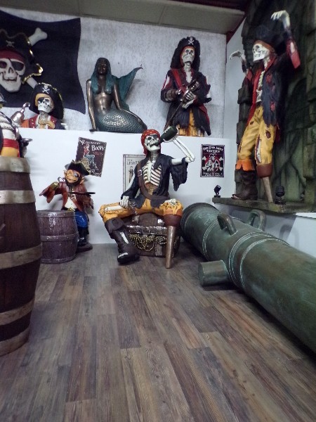 SQUELETTE PIRATE ASSIS SUR UN TRÉSOR ET BUVANT A LA BOUTEILLE